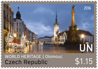 Druhá známka emise má nominální hodnotu 1,15 USD, jejím námětem je Olomouc, fotografie zachycuje Horní náměstí s radnicí a Sloupem Nejsvětější trojice. Do Světového dědictví byla zapsána v roce 2000.